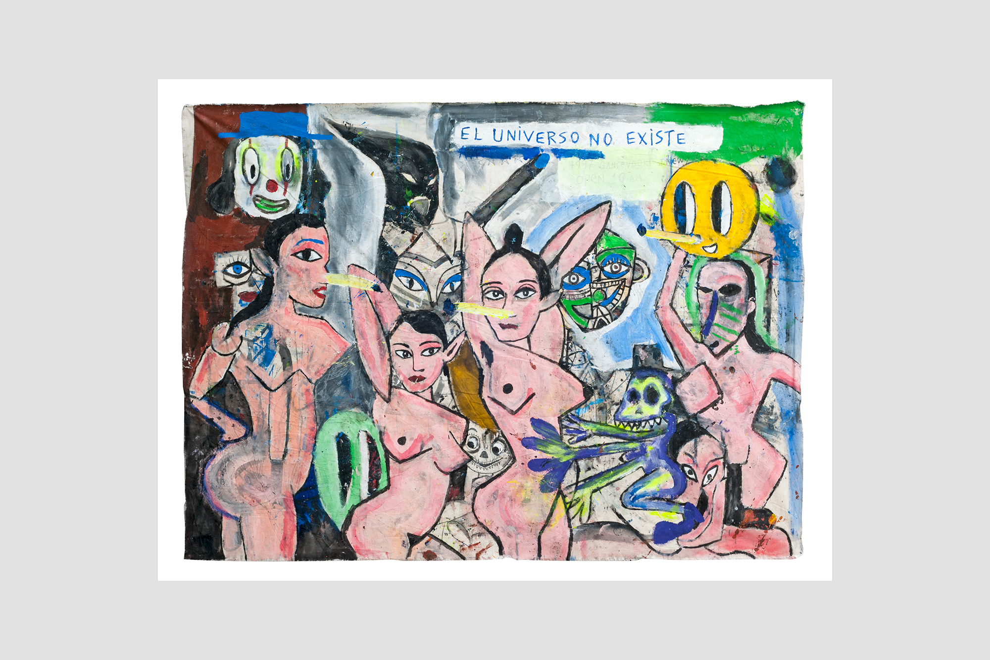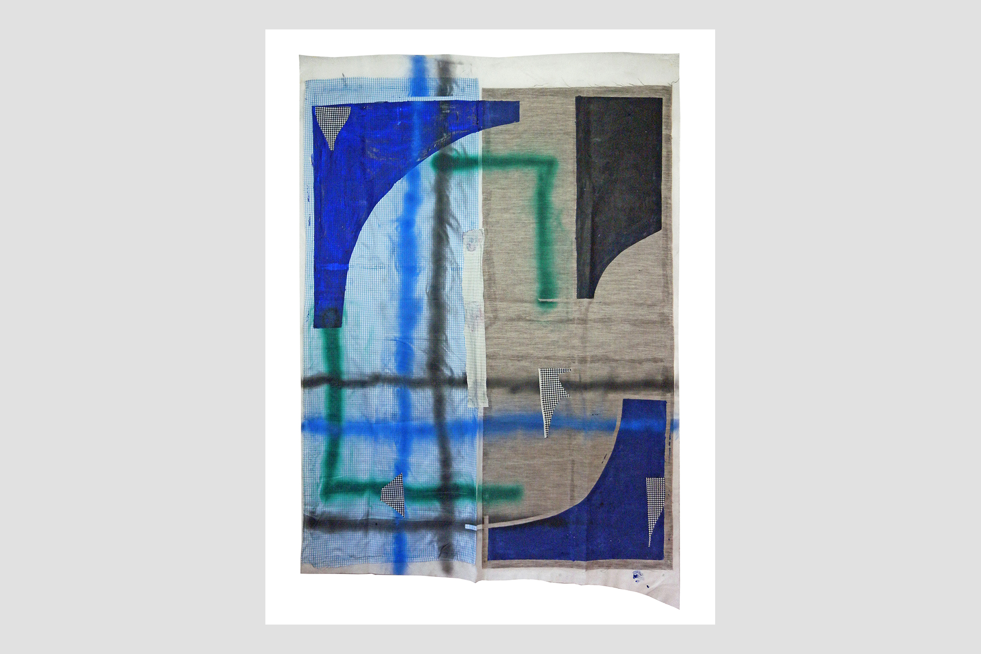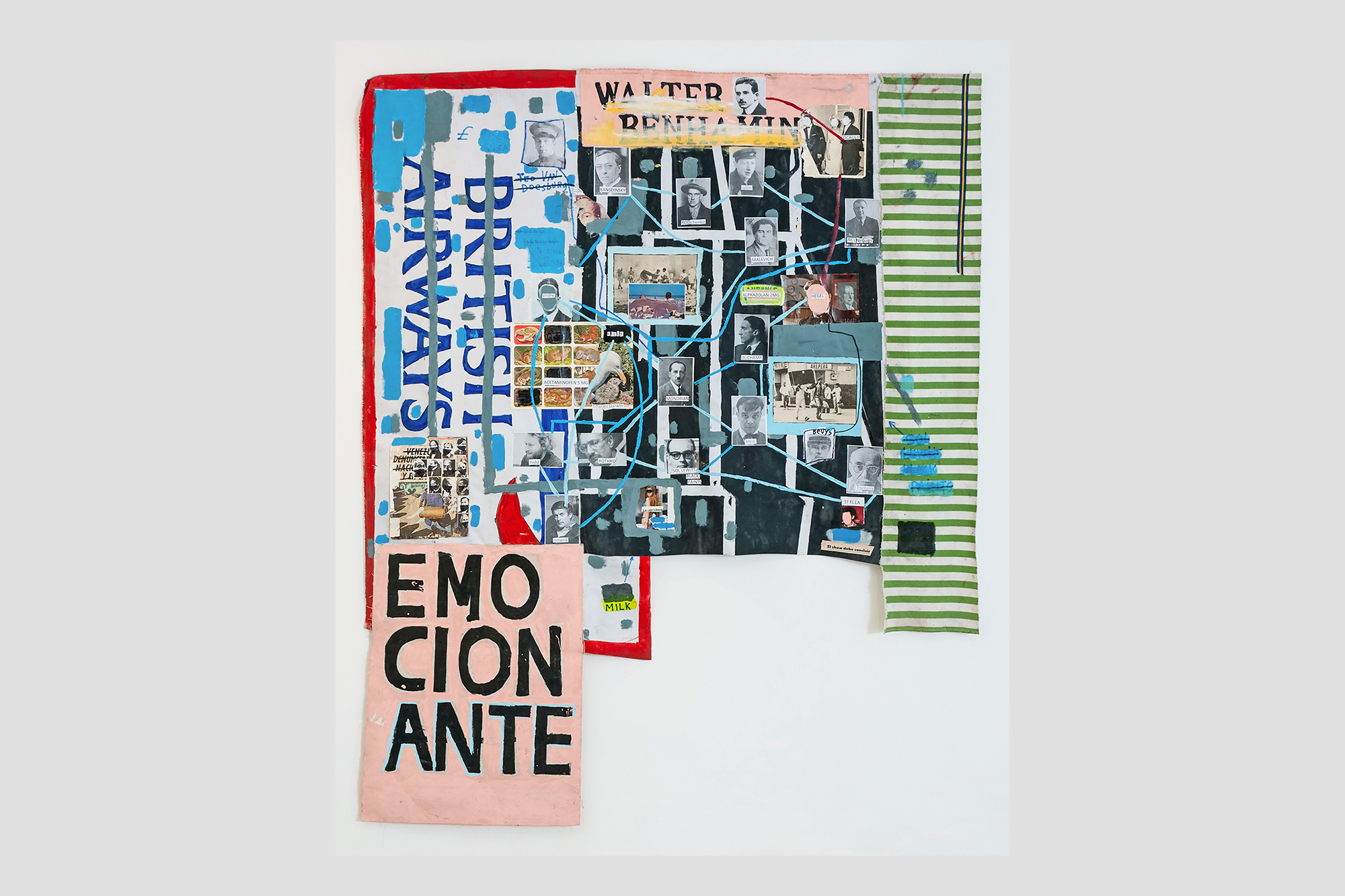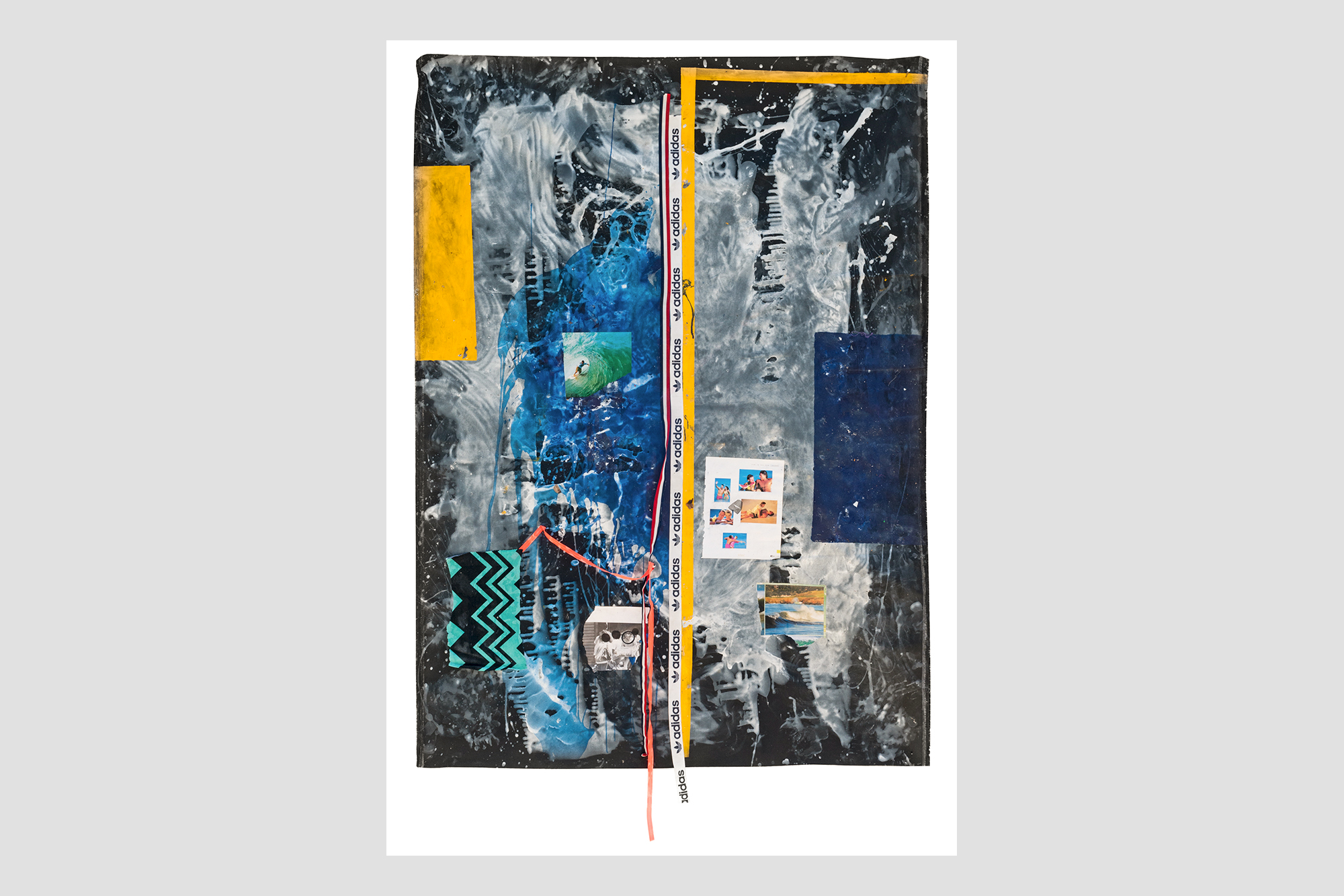 aceite, cinta elástica y papel sobre tela. 209 x 152 cm.