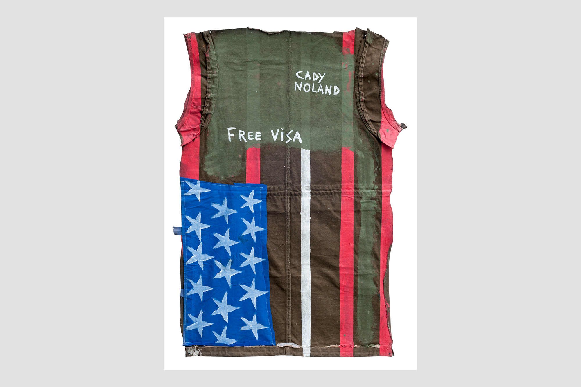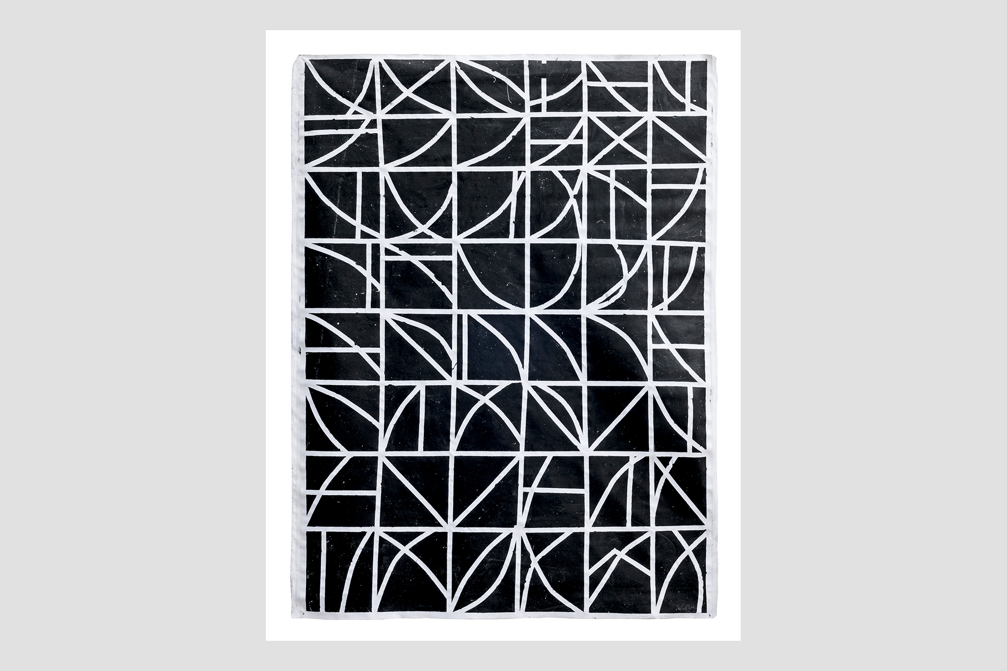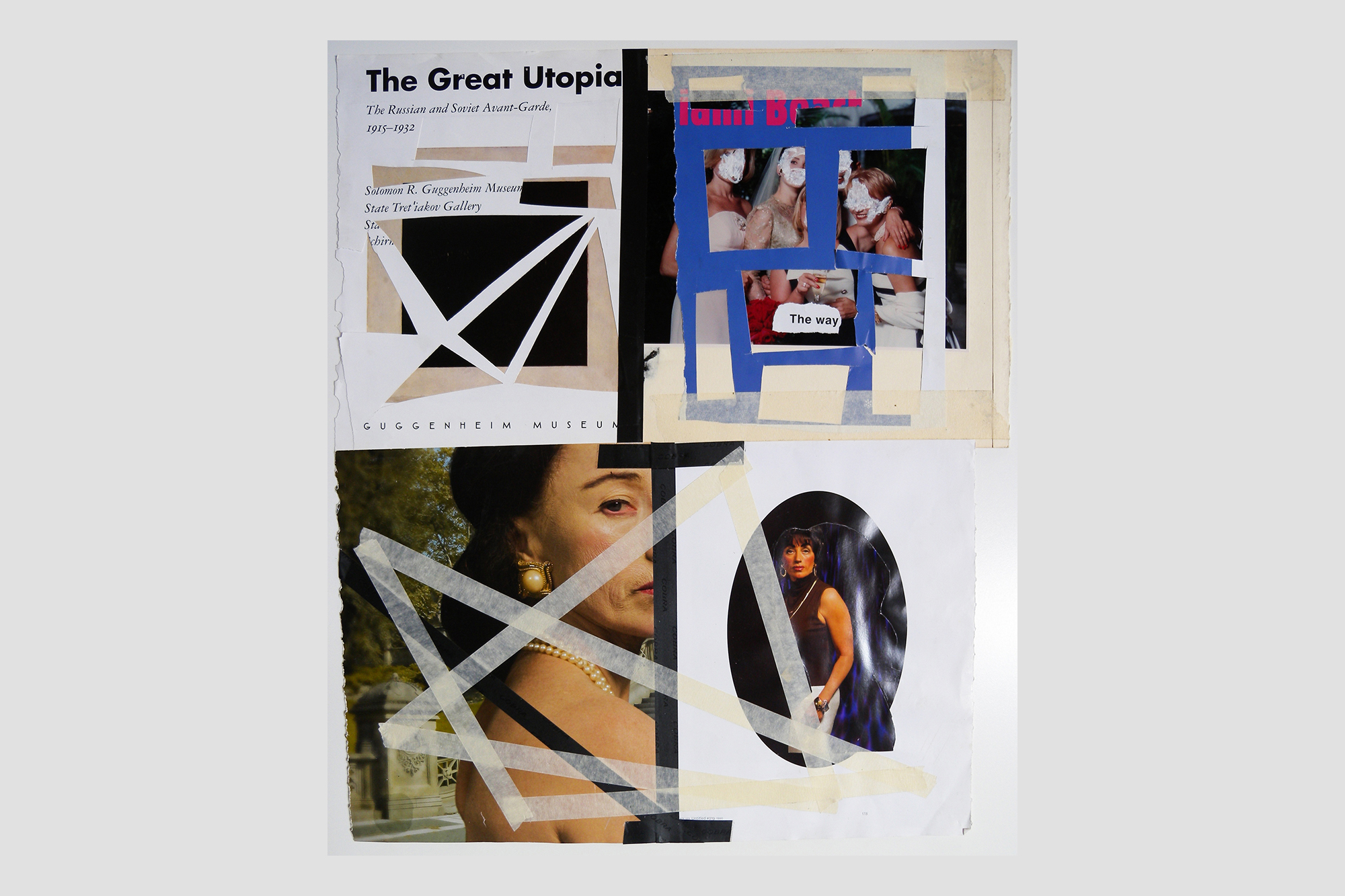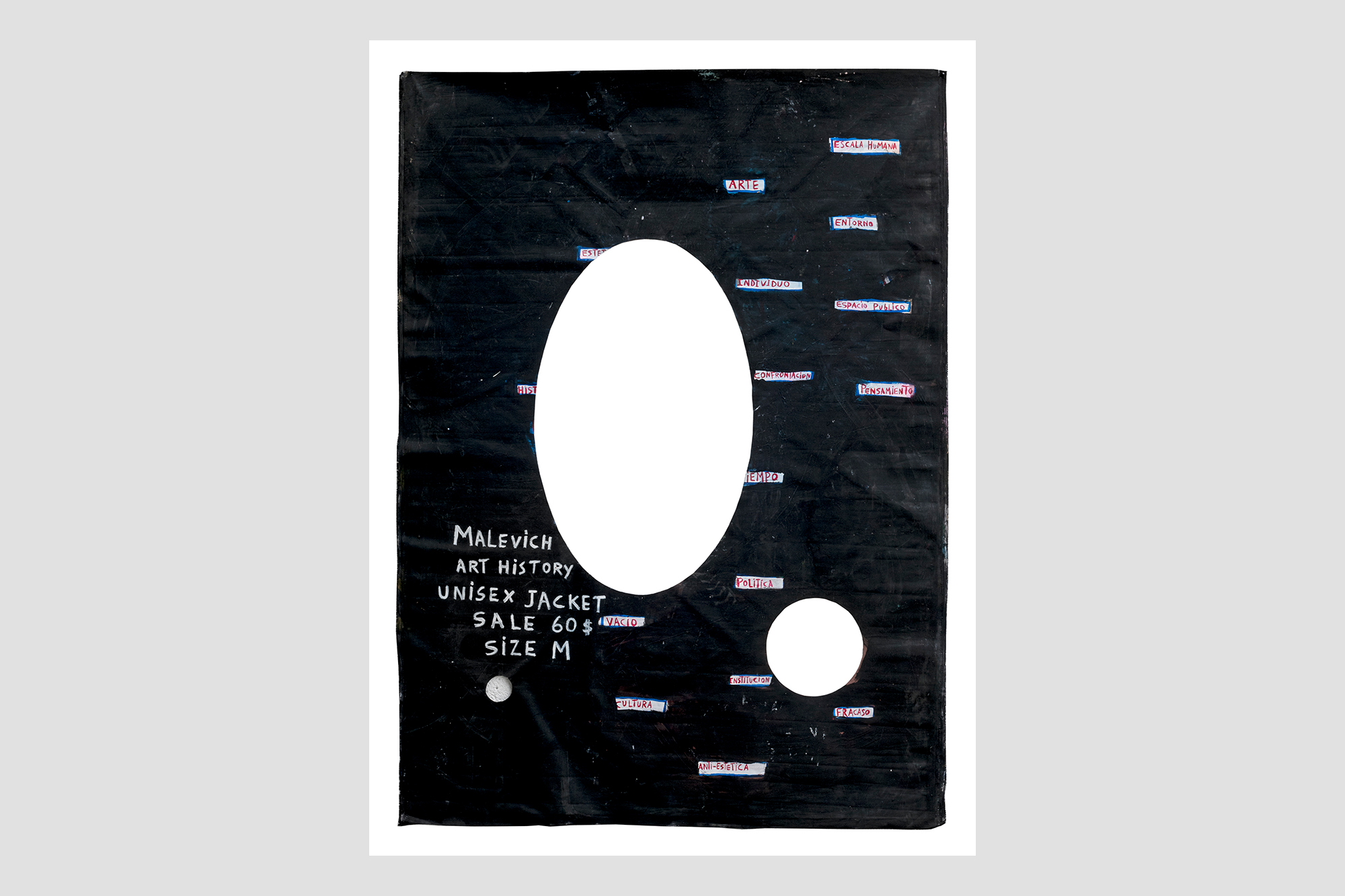 aceite, cinta elástica y papel sobre tela. 209 x 152 cm.