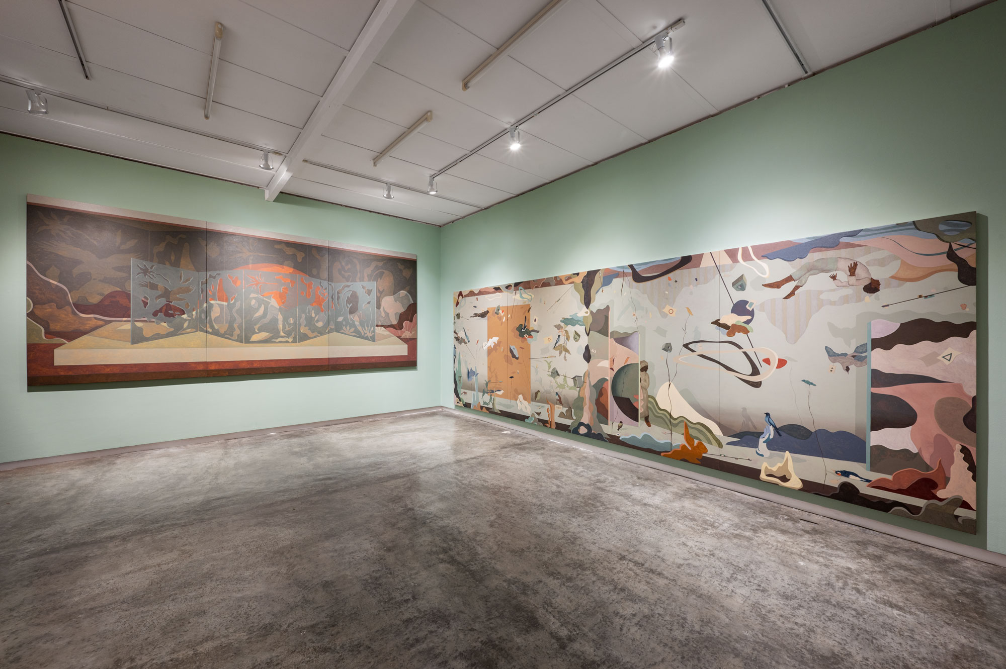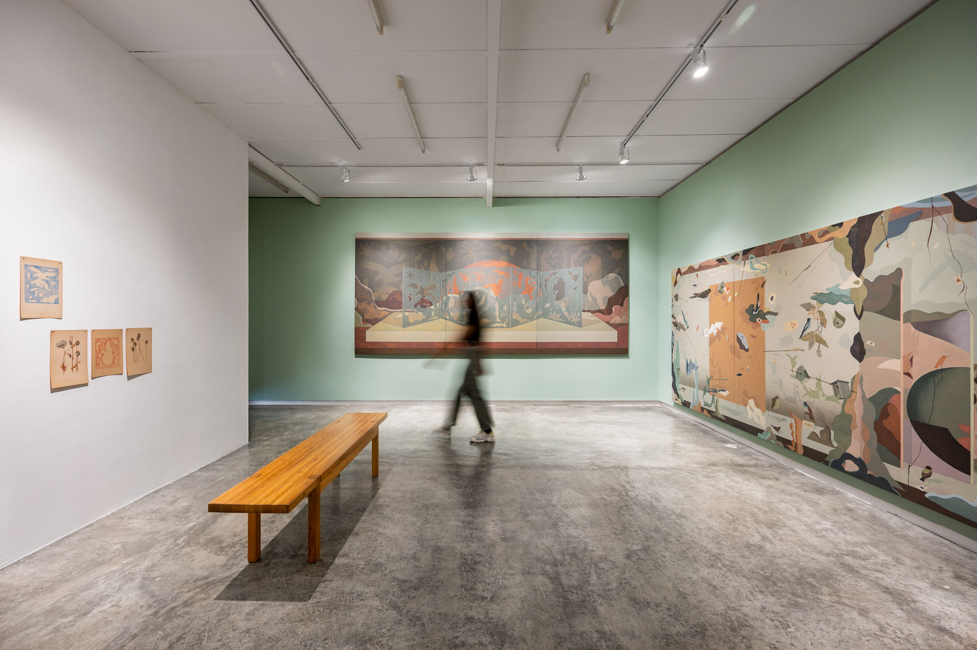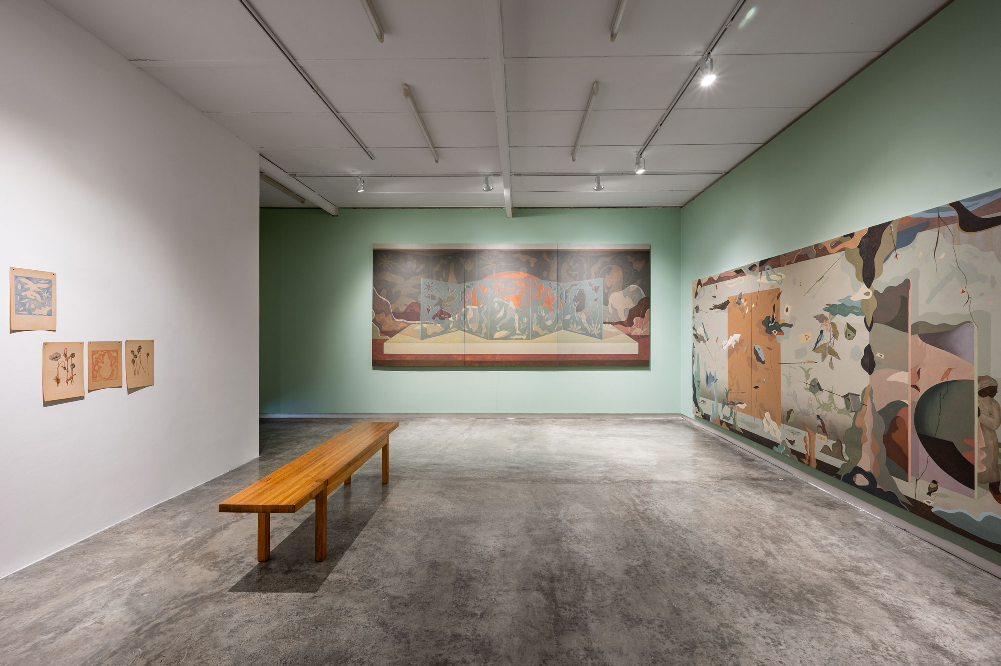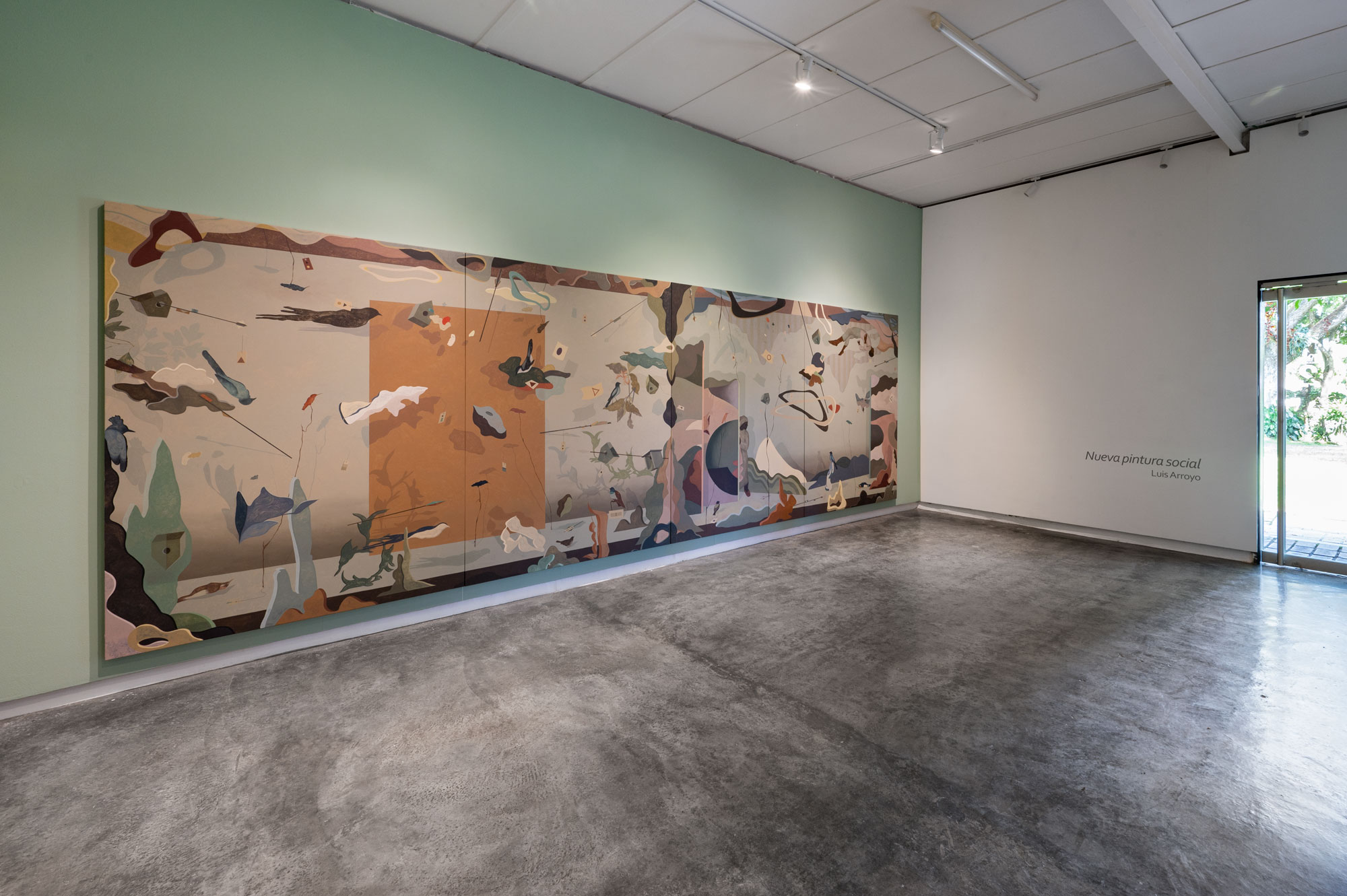 esta exposición presenta una selección acotada de obras. dos óleos sobre tela de gran formato: »la orfandad solar de lo traslúcido«, 2025 (183 x 548 cm.) y »frutal de la noche oscura«, 2025 (183 x 411 cm.); más una pintura de pequeño formato »luz jaguar«, 2025 (50 x 65 cm.) y una breve serie de dibujos sobre papel. en este conjunto confluyen las convicciones del artista acerca de la autonomía del lenguaje pictórico, con invocaciones a una herencia estética y ética extemporánea. en esta producción reciente el artista, como legatario, asume con libertad tanto ausencias y vacíos como cargas de una herencia que no eligió. esto con la intención de modelar y defender una cosmovisión pictórica singular. de esta forma, las dos obras centrales están construidas con planos superpuestos y recursos diversos, logrando un efecto escenográfico. la perspectiva frontal, el tratamiento de luces y sombras, así como los planos de color y las atmósferas cromáticas acentúan el sentido de puesta en escena. los ambientes están organizados por bastidores, biombos o paneles de diversas formas y diseños: serpenteantes, sinuosos, geométricos, orgánicos. en los entornos resaltan personajes, elementos vegetales, animales y objetos. estas pinturas pueden ser vistas como cuadros teatrales, en los que convergen menciones sublimadas a diversas realidades sociales, políticas, ecológicas, culturales.