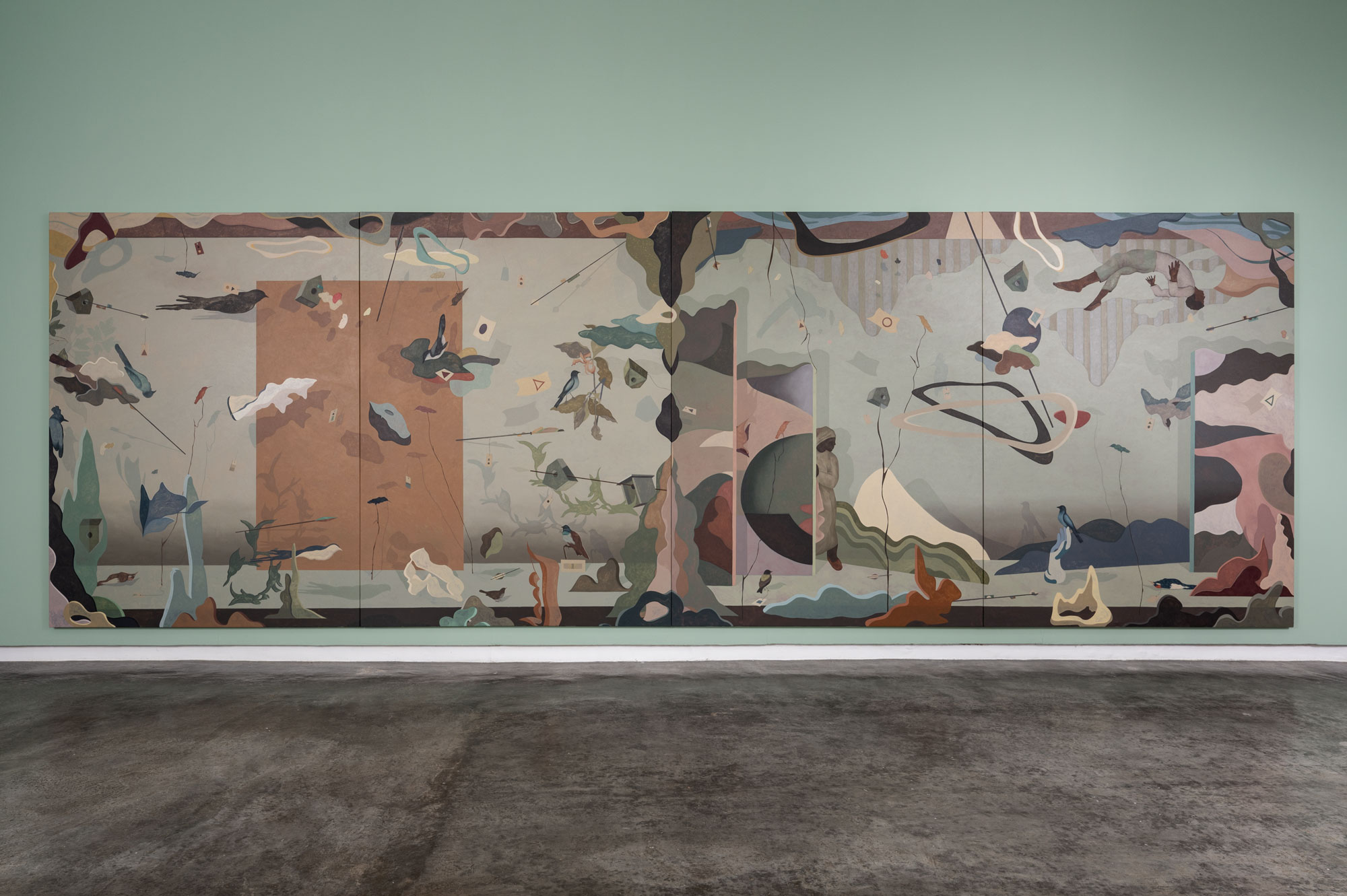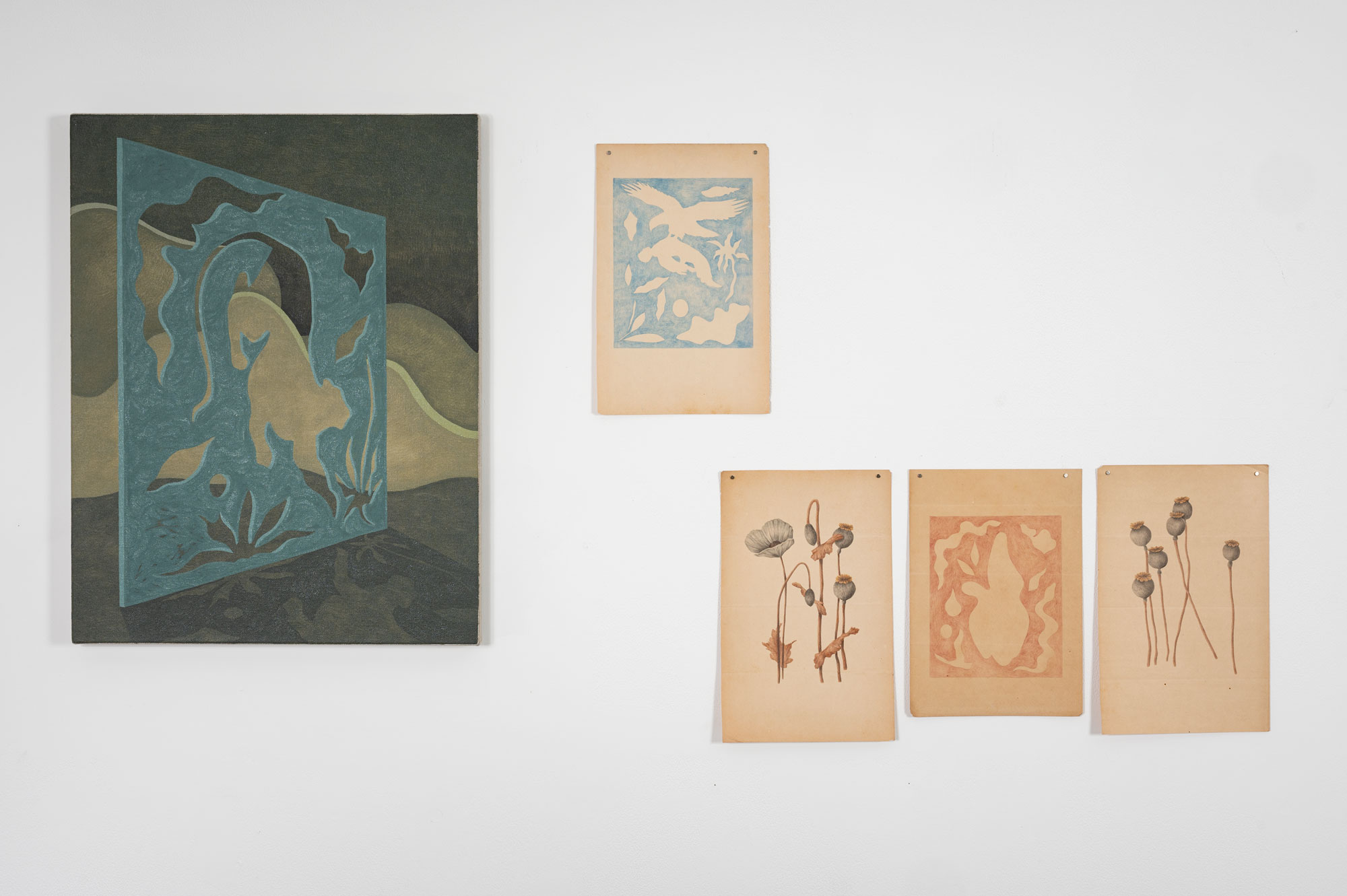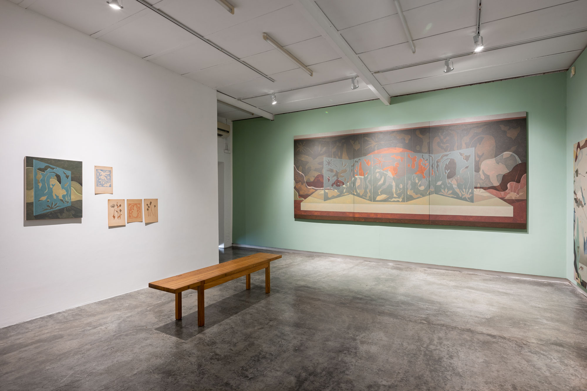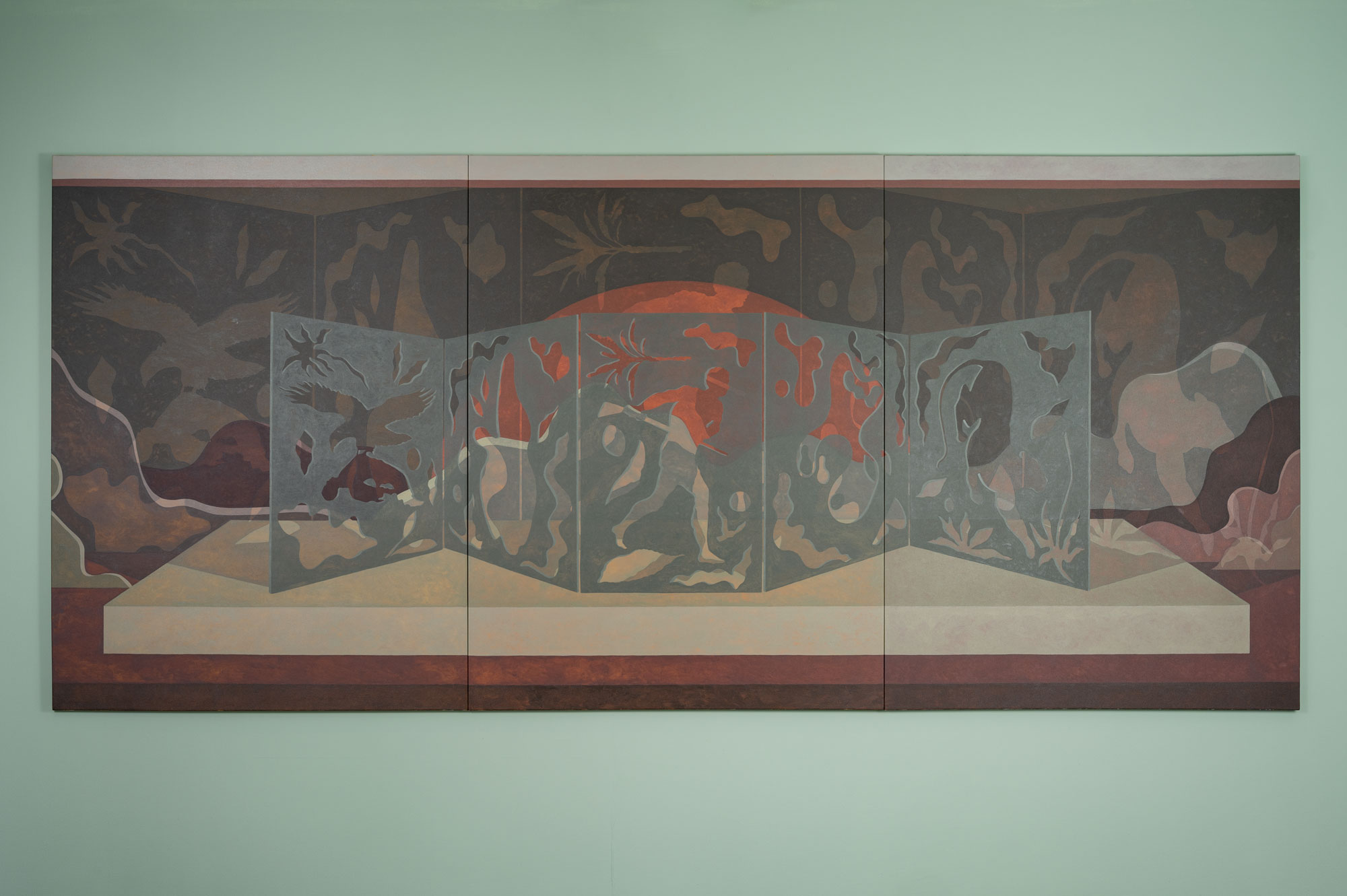 esta exposición presenta una selección acotada de obras. dos óleos sobre tela de gran formato: »la orfandad solar de lo traslúcido«, 2025 (183 x 548 cm.) y »frutal de la noche oscura«, 2025 (183 x 411 cm.); más una pintura de pequeño formato »luz jaguar«, 2025 (50 x 65 cm.) y una breve serie de dibujos sobre papel. en este conjunto confluyen las convicciones del artista acerca de la autonomía del lenguaje pictórico, con invocaciones a una herencia estética y ética extemporánea. en esta producción reciente el artista, como legatario, asume con libertad tanto ausencias y vacíos como cargas de una herencia que no eligió. esto con la intención de modelar y defender una cosmovisión pictórica singular. de esta forma, las dos obras centrales están construidas con planos superpuestos y recursos diversos, logrando un efecto escenográfico. la perspectiva frontal, el tratamiento de luces y sombras, así como los planos de color y las atmósferas cromáticas acentúan el sentido de puesta en escena. los ambientes están organizados por bastidores, biombos o paneles de diversas formas y diseños: serpenteantes, sinuosos, geométricos, orgánicos. en los entornos resaltan personajes, elementos vegetales, animales y objetos. estas pinturas pueden ser vistas como cuadros teatrales, en los que convergen menciones sublimadas a diversas realidades sociales, políticas, ecológicas, culturales.